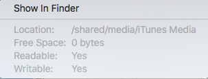 Trying to span any content from other locations to the NFS-based iTunes Media directory is not possible with TuneSpan, because it falsely assumes that 0 bytes are available on the Volume.