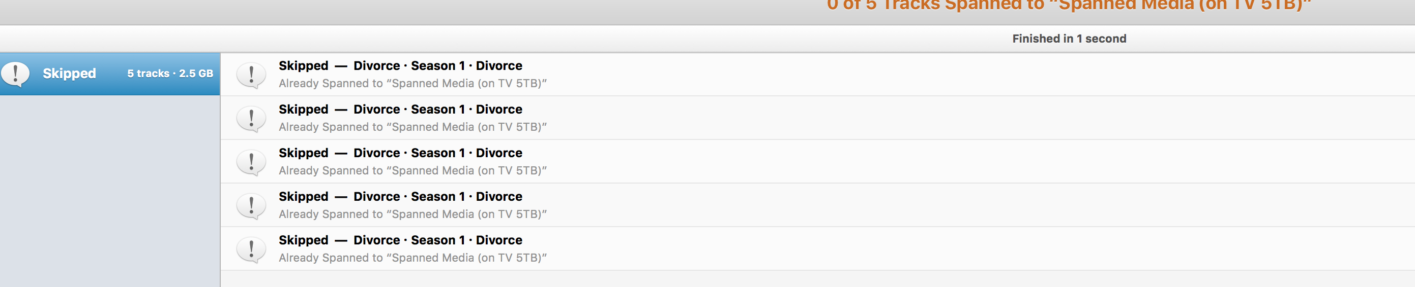 I'd really love to remove these Skipped errors/notifications please. The files are on the external hard drive properly, iTunes displays and plays properly. But for some reason every single span process, I get these "skipped" notifications or errors say they've skipped those files because they're already on the target drive.