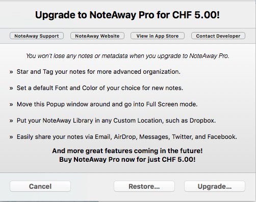 Or, does NoteAway just seem to not remember that you already had NoteAway Pro and your having to click to Upgrade and restore manually? > I'm using the free version, because I only need the app on one computer.