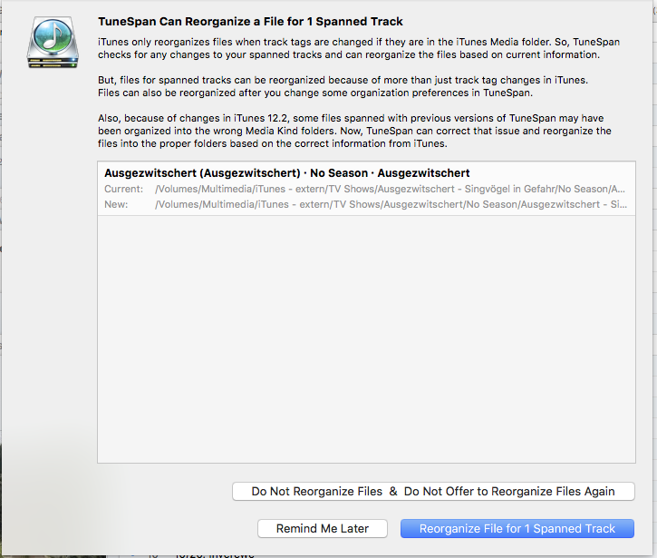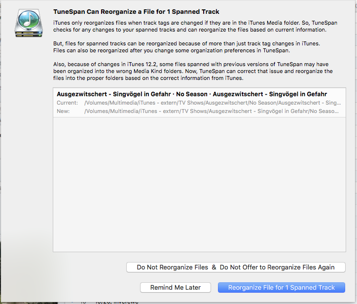 my TV-shows of iTunes are all spanned to a NAS. I changed the name of a spanned TV-Show. At next start of TuneSpan I am asked, if this track should be reorganized. After saying "Yes", the reorganization runs.