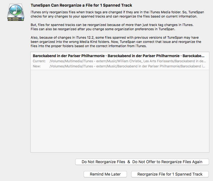 5. TuneSpan offers again to "reorgnize". (2nd screenshot). If I click "remind me later" it offers to reorganize each time when I start TuneSpan. After I give up, it reorganizes back to the original name and it is also changed back in iTune.