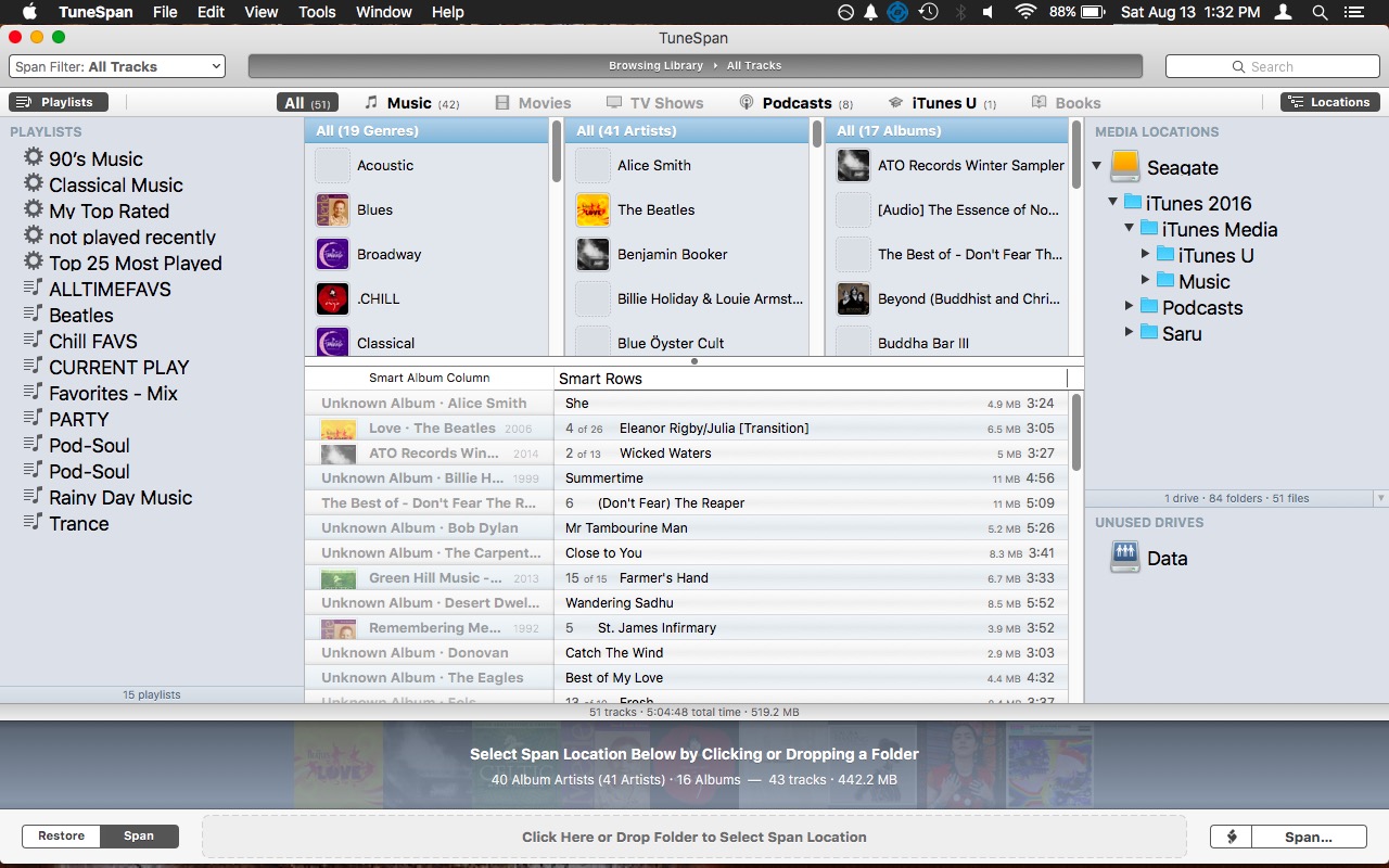 I moved my iTunes library to my portable external hard drive. I thought I did it correctly, but my playlists are missing many songs. In any case, when I tried telling TuneSpan where my new library is, and ran Span, it only found 40 songs out of over 3,000.