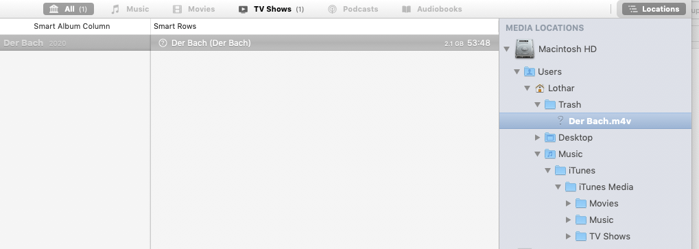 I am sill using TuneSpan with iTunes on macOS Mojave. When I try to span a specific video, which according to TuneSpan and iTunes is located in a folder called "Trash", TuneSpan can not find it (see screenshots attached). I also do not find this folder and not the video. But if TuneSpan recognises this file, it should be somewhere. Do you have an idea, how and where to find it?
